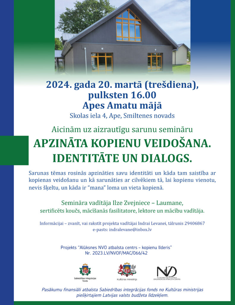 Biedrība “Alūksnes nevalstisko organizāciju atbalsta centrs” arī šogad 2024. gadā turpina īstenot Sabiedrības integrācijas fonda atbalstīto projektu “Alūksnes NVO centrs – kopienu līderis”, projekta aktivitātes sākam ar aizrautīgu sarunu semināru “Apzināta kopienu veidošana. Identitāte un dialogs”.