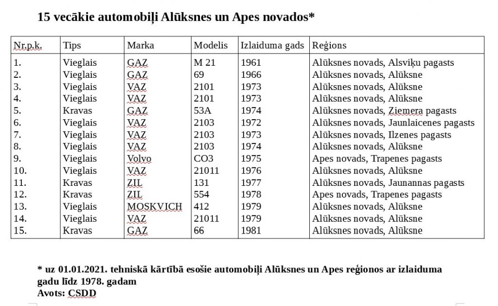 Izrādās, Alūksnes un Apes novados ir arī citi vairākus gadu desmitus veci spēkrati. Ceļu satiksmes drošības direkcijas pārstāvis Aldis Lāma vēsta, ka vecākais uz 1. janvāri tehniskā kārtībā esošais auto Alūksnes un Apes novados ir 1961. gada izlaiduma tieši tāda pati “Volga” kā apenietim. Vecākie mūspusē ir arī “VAZ 210” jeb tā saucamās “kapeikas”, bet ir arī daži retro kravas automobiļi. Vairāk var uzzināt tabulā.