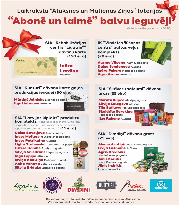 Gaidām arī citus veiksminiekus pēc laimestiem redakcijas telpās, Rūpniecības ielā 7a, Alūksnē katru darba dienu no pulksten 8.30 līdz 17.00 (loterijas atļaujas numurs 6510).