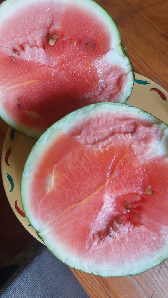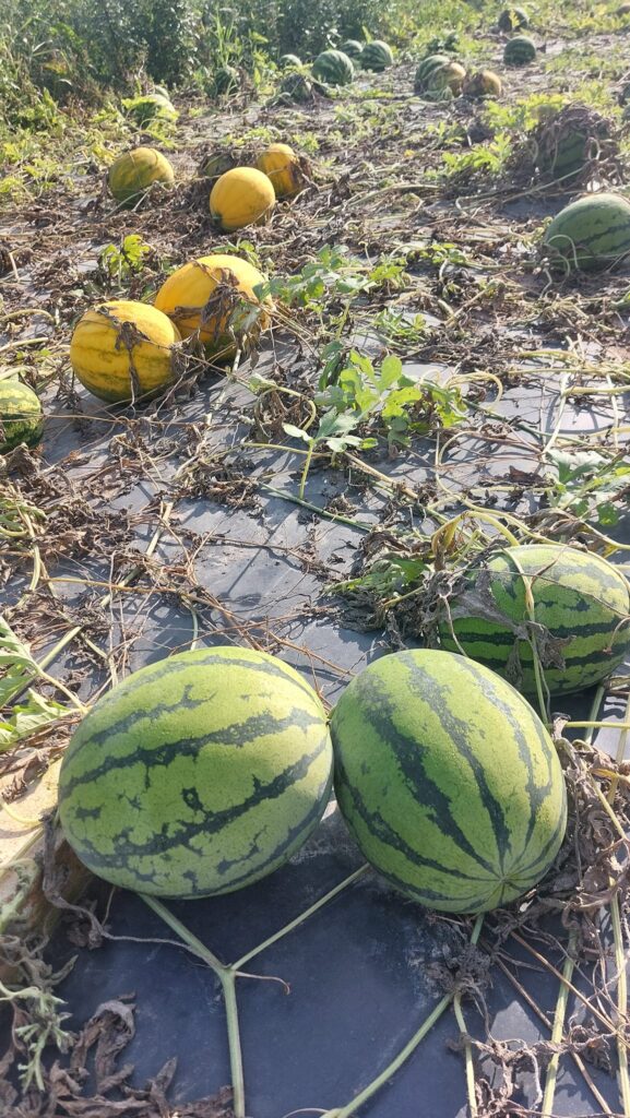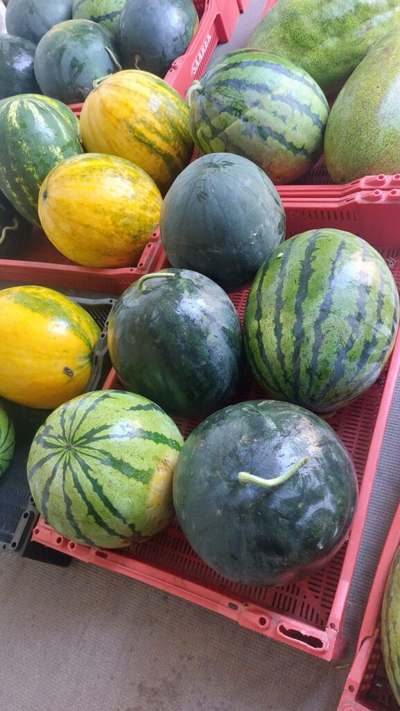 “Raža ir laba. Arbūzi nav ļoti lieli, vidēji katrs sver piecus kilogramus. Vai arbūzs ir liels vai mazs, garša pārāk neatšķiras. Pavisam maziņiem, ko var ielikt vienā plaukstā, protams, garša nav tik izteikta. Tā kā šķirņu ir daudz, varam vērtēt, kas ir garšīgāks un kas labāk aug, kuru šķirni pircēji labāk izvēlas,” stāsta Sintija un teic, ka pieprasītākie ir ‘Bedouin’ šķirnes arbūzi, kam ir gaiši zaļa miza ar tumšām svītrām, bet arbūza mīkstums ir sarkans, salds un kraukšķīgs. Topā esot arī dzeltenie arbūzi. “Tā ir gaumes lieta. Cilvēki labprāt nogaršo dažādu šķirņu ogas,” saka Sintija. Vai arbūzs gatavs vai nē, var noteikt pieklauvējot – ja skaņa ir dobja, tas ir nogatavojies. “Klauvējot pa tirdzniecībai izliktajiem arbūziem, skaņa būs visiem viena – dobja, jo gatavi. Savukārt, klauvējot uz lauka, var sadzirdēt skaņas atšķirības,” saka Sintija. Ja tomēr gadās pārdot negatavu arbūzu, viņi vienmēr samaina pret citu, tādēļ aicina pircējus ar sūdzībām vērsties pie viņiem. Slikti ražu ietekmējis lietainais augusts, līdz ar ko arbūzi pārstājuši augt lielāki. Lai arbūzi augtu, naktī jābūt vismaz +20 grādiem, saka Sintija.