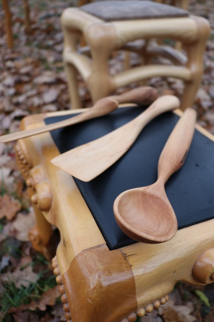 Viņš darina karotes, lāpstiņas, svečturus, gleznu rāmji, māju norādes, krēslus, ķebļus, darināti arī krucifiksi, plānos – naktsskapīši, gultas, virtuves iekārtas un cits interjers.