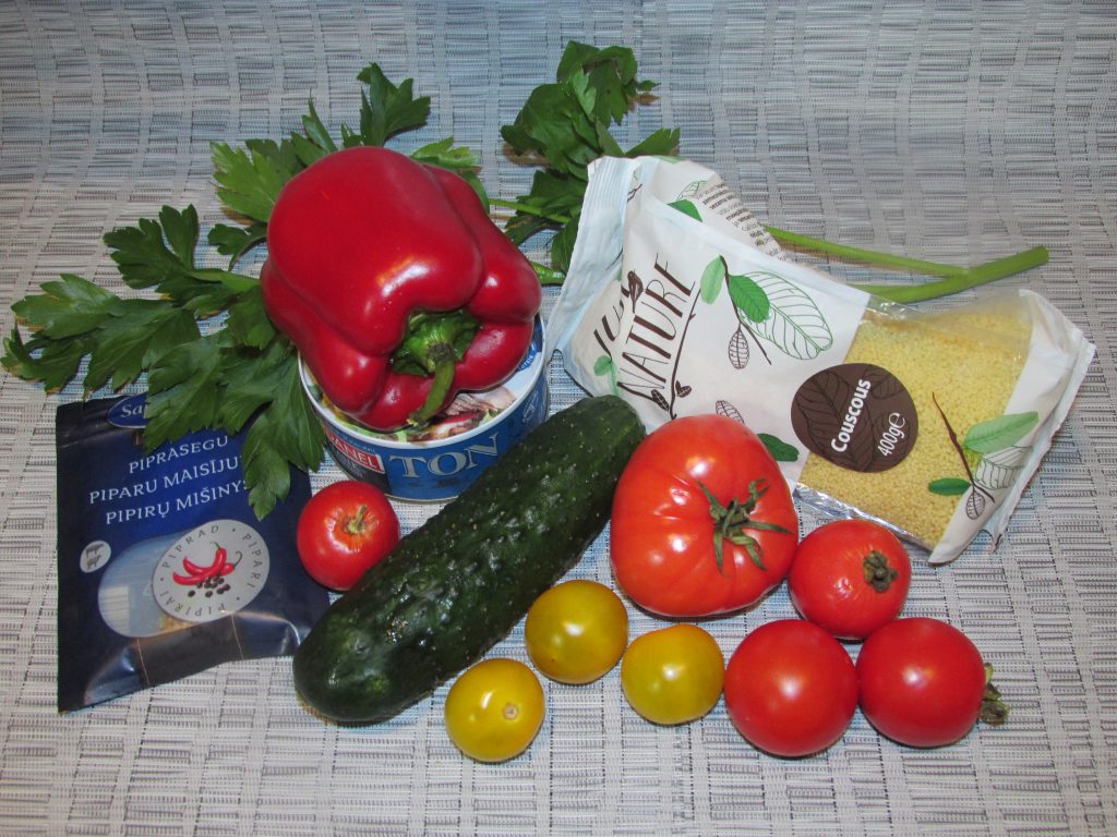 Kuskusu pārlēju ar ½ glāzes vārīta un pasālīta ūdens, pārsedzu ar vāku un pēc 15 minūtēm ar dakšiņu uzirdināju. Saldo piparu atbrīvoju no sēkliņām un sagriezu strēmelītēs, tomātus – daiviņās, bet gurķi – pusripiņās.
