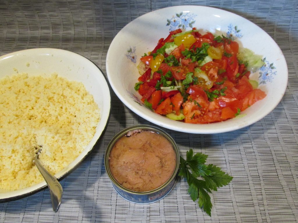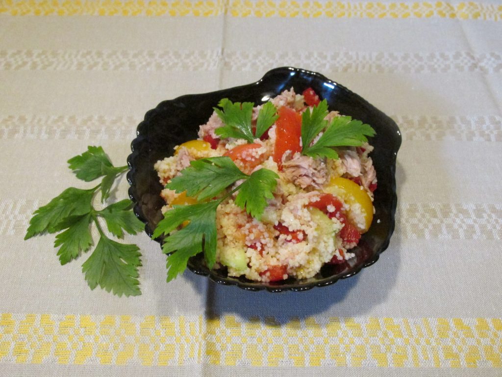 Kuskusam pievienoju sagatavotos dārzeņus, tunci no kārbiņas, piekaisīju sasmalcinātus pētersīļu zaļumus, sāli, piparus un pārlēju ar eļļu no konserviem. Garšoja ļoti labi.