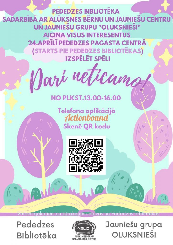 “Izspēlēt spēli “Dari neticamo!” varēs sestdien, 24. aprīlī, sev ērtā laikā no pulksten 13.00 līdz 16.00. Starts būs pie Pededzes bibliotēkas. Ieteikumi spēles dalībniekiem: pārliecināties, vai viedtālrunis ir pietiekami uzlādēts. Lejupielādēt aplikāciju “Actionbound”. Telefona iestatījumos pārliecināties, ka atļauts aplikācijai noteikt savu lokāciju un ir dota piekļuve kamerai, jo tas noderēs. Spēles kodu varēs noskenēt pie Pededzes bibliotēkas vai caur saiti https://actionbound.com/bound/darineticamo