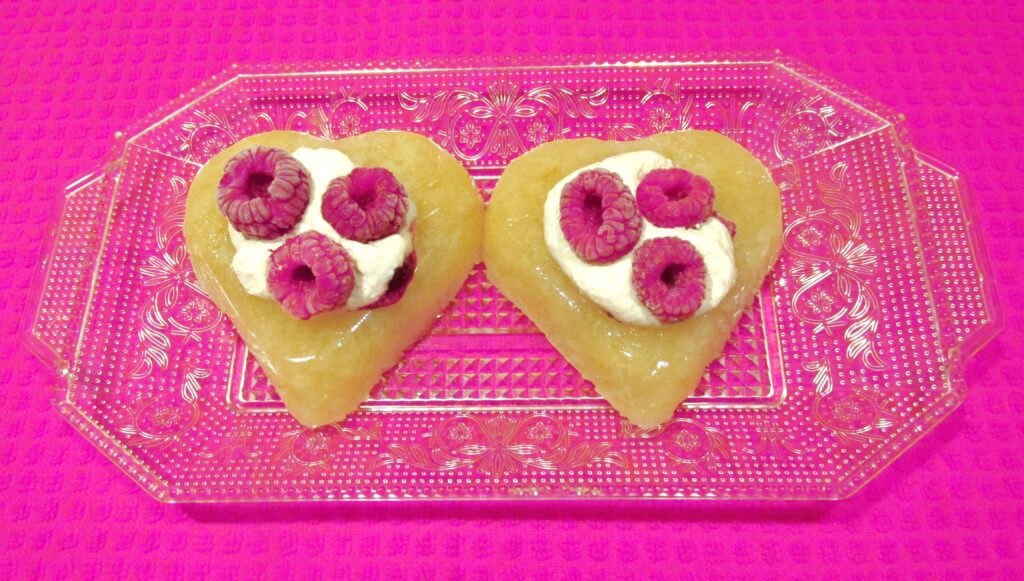 Izvārītos ābolus un bumbierus sietā notecināju (augļu sīrupu izliet nevajag, to vēlāk varam izdzert gardu muti) un sablendēju. Receptē norādīto cukuru nepievienoju. Tā kā augļu masa jau tā šķita saldena, jo satur dabīgos cukurus, pielēju pat nedaudz citrona sulas. Tad pievienoju arī izšķīdināto želatīnu, labi samaisīju un salēju ar pārtikas plēvīti izklātās sirdsveida veidnītēs. Želeju atdzesēju, pēc tam sarecēšanai ievietoju ledusskapī. Pēc vairākām stundām sastingušās sirsniņas atbrīvoju no veidnītēm un rotāju ar putukrējumu un avenēm.