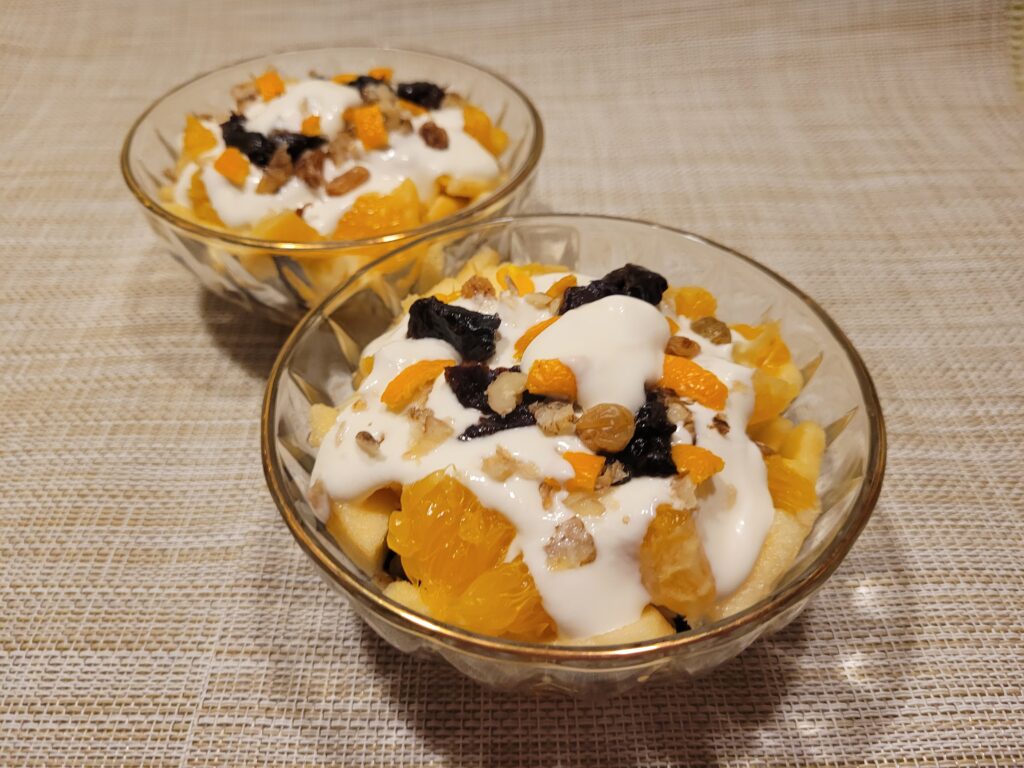2 āboli, 2 apelsīni, 4 mandarīni, 200 gramu žāvētu melno plūmju, 50 gramu rozīņu, 50 gramu riekstu, 1 citrons. Mērcei: 200 gramu skābā krējuma, 50 mililitru 33% saldā krējuma, 20 mililitru baltvīna, 20 gramu pūdercukura, vaniļas cukurs.