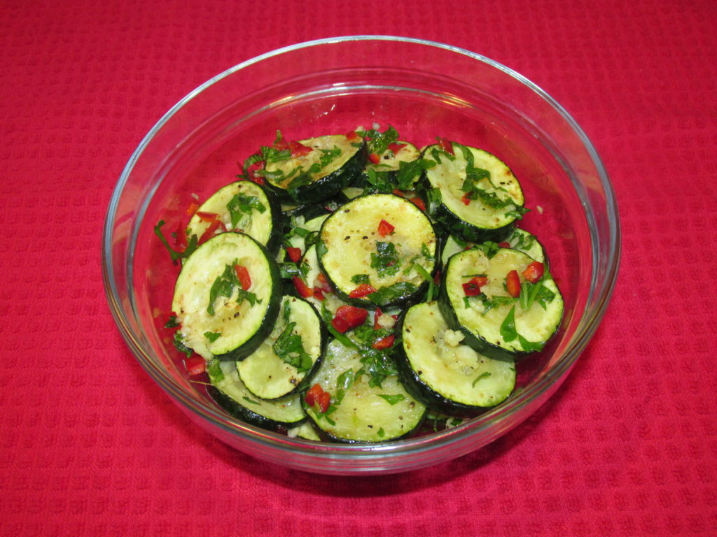 Cukīni, citronu, aso pipariņu un zaļumus noskaloju un nosusināju. Cukīni sagriezu ripiņās, biezumā līdz vienam centimetram. Pusei citrona plāni nogriezu miziņu un smalki sakapāju, bet skābajam auglim izspiedu sulu. Pipariņu pārgriezu gareniski uz pusēm, iztīrīju sēkliņas un sagriezu ļoti smalkās strēmelītēs. Ķiplokus sasmalcināju spiedē, zaļumus sakapāju. Cukīni ripiņas apkaisīju ar pipariem un apcepu no abām pusēm pannā ar uzkarsētu eļļu. Apceptās ripiņas kārtoju bļodiņā, pārkaisīju ar citrona miziņām, ķiplokiem, pētersīļu zaļumiem un asā pipariņa strēmelītēm.