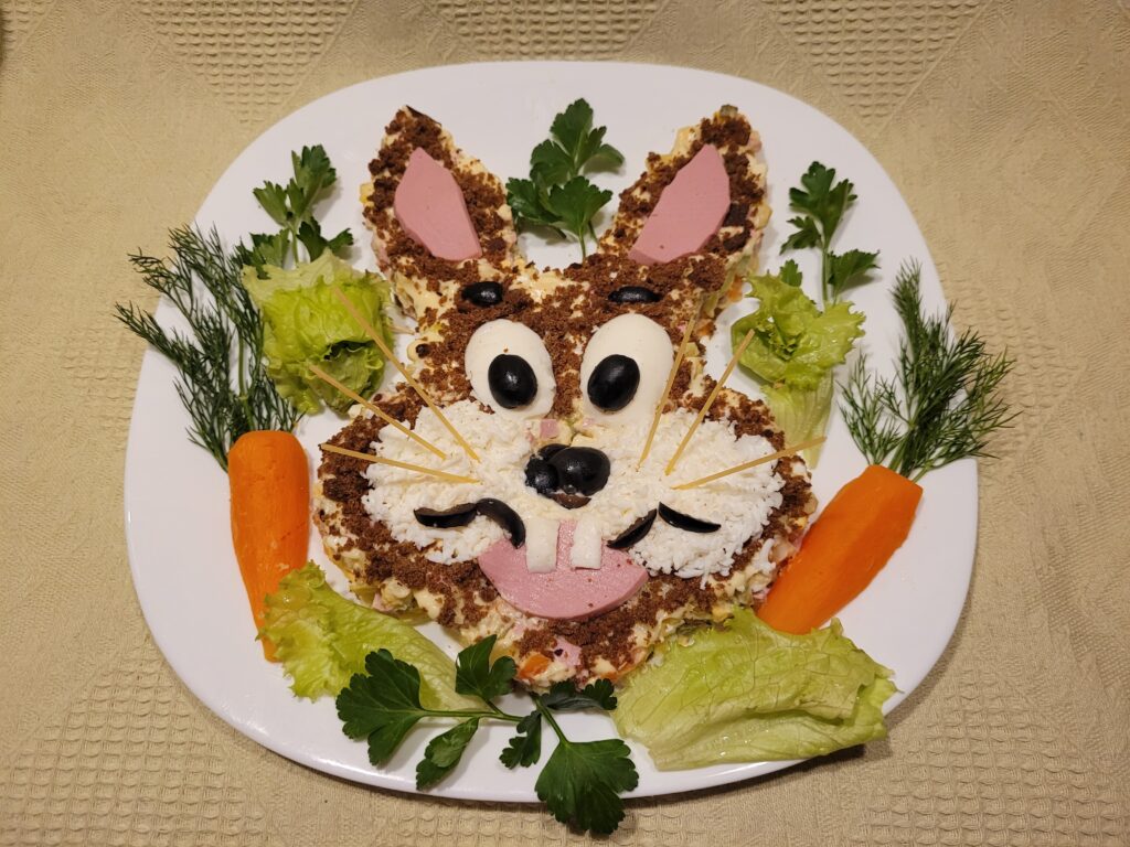 Saskaņā ar Austrumu Mēness kalendāru Jaunais gads sāksies tikai 22. janvārī. Šogad tā simbols ir Melnais ūdens trusis (Kaķis, Zaķis). Tāpēc gada sākumā pagatavoju apēdamu trusīti. Šim nolūkam varam izmantot kādus no saviem iecienītajiem salātiem, kas “tur formu” un neizplūst.