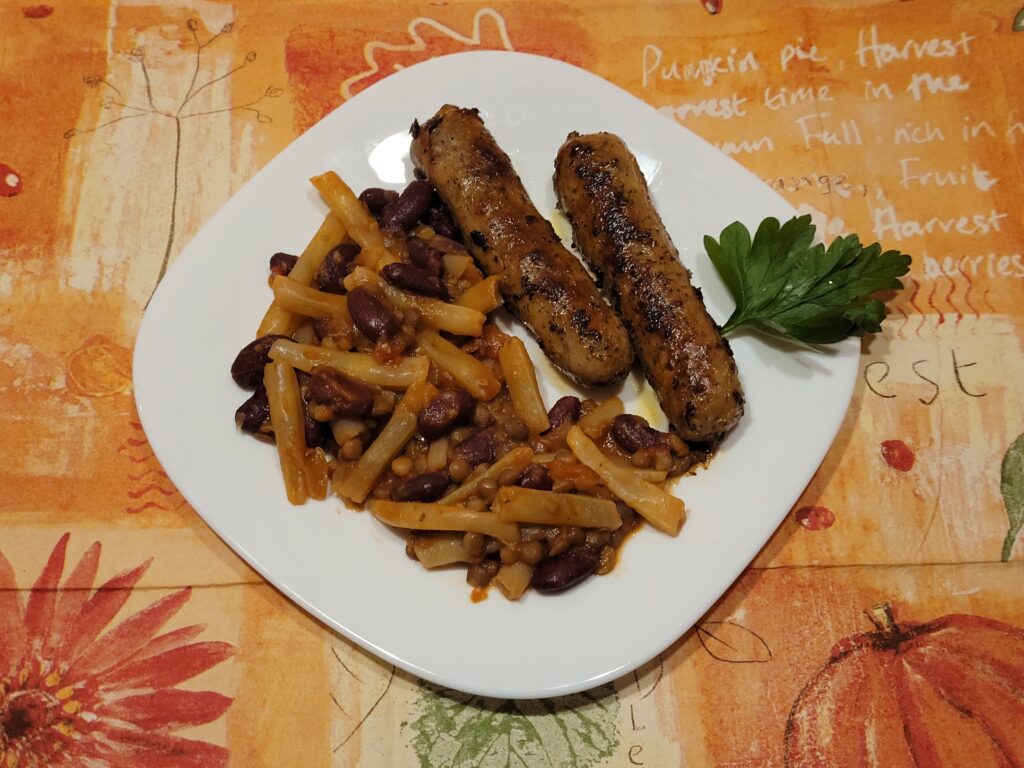 Kad sīpoli bija apcepušies, tiem pievienoju tomātus un izvārītās pākšu pupiņas, piekaisot arī sāli un piparus. Piemetu vēl arī šķipsniņu kaltēto Provansas garšvielu maisījuma. Apjaucot visu sautēju minūtes desmit. Visbeidzot piemaisīju notecinātas konservētās sarkanās pupiņas un lēcas. Visu vēl minūtes desmit pasautēju un varēju izmantot kā piedevu gaļas ēdienam.