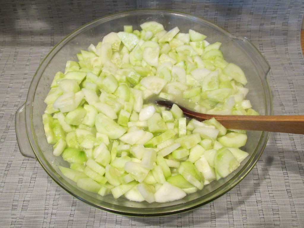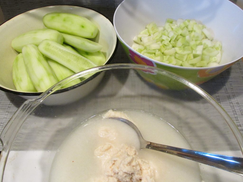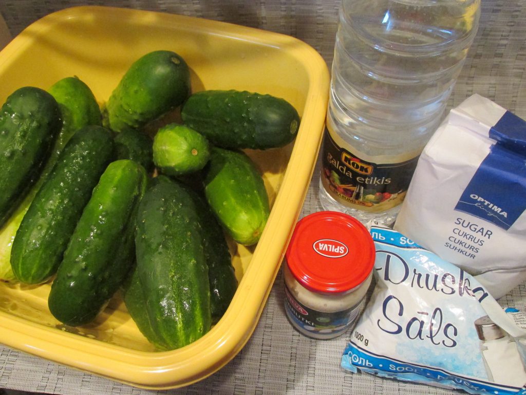 Nomizotus gurķus sagriezu apmēram 0,5 centimetrus biezās šķēlītēs. Bļodā samaisīju marinādei paredzētajās sastāvdaļas, pielēju ūdeni (iepriekšējā reizē gan biju ņēmusi 100 mililitru receptē norādīto 200 mililitru vietā, jo gurķi jau tāpat sulojas, bet ūdeni laikam vajag tāpēc, lai atšķaidītu pārāk stipros mārrutkus), piejaucu gurķus un liku lielo trauku vēsumā uz 24 stundām, laiku pa laikam visu vēl apmaisot. Pēc tam sapildīju burkās un aizvākoju. Nav jāsterilizē, bet jāglabā vēsā vietā, tādēļ burciņas ar vismaz 2,5 litru kopējo saturu saliku ledusskapī. Ilgi jau tās tur tāpat neglabāsies…