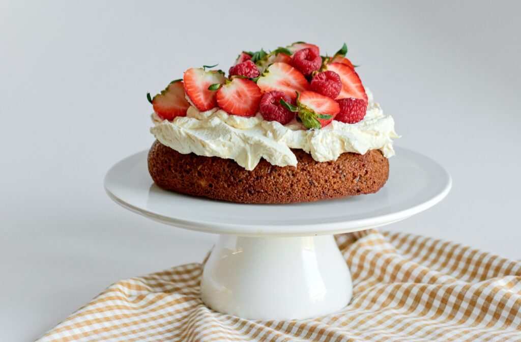 7. Pagatavo krēmu – saputo vai samaisi rikotu ar krēmsieru, medu un kanēli, un liec to kūkai virsū, izlīdzina ar karoti piešķirot krēmam formu pēc savas izvēles.