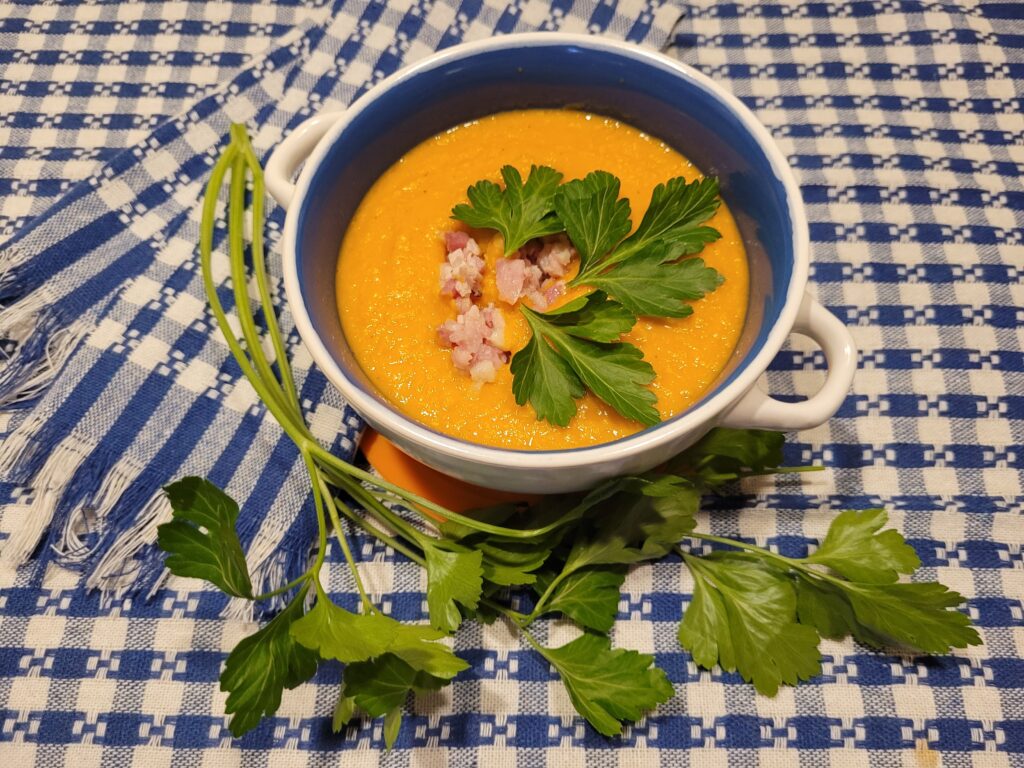 Minūtes piecas pirms zupas gatavības piekaisīju sāli un piparus. Gatavo zupu sablendēju un vēl dažas minūtes pavārīju. Galdā to varam celt kopā ar pilngraudu maizi. Zupa būs barojoša bez gaļas, taču tā labi saderēs arī ar kādu kūpinājumu.