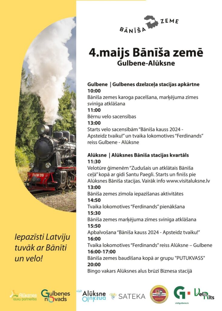 Svētku ietvaros Alūksnes Tūrisma informācijas centrs aicina uz velo pasākumu Alūksnes un Alsviķu apkārtnē, velo gides Santas Paegles vadībā. Velo tūre ļaus iepazīt daļu no kādreiz 28 kilometrus garā šaursliežu dzelzceļa līnijas posma Alūksne – Ape, pabūt vietā, kur mitušas gan augstdzimušas dāmas, gan nepaklausīgas meitenes, cik tuvu Bānītis ir vidzemnieku iecienītai pludmalei Rīgas jūras līcī, un izzināt daudzus citus faktus un vietas Bānīša zemē.
