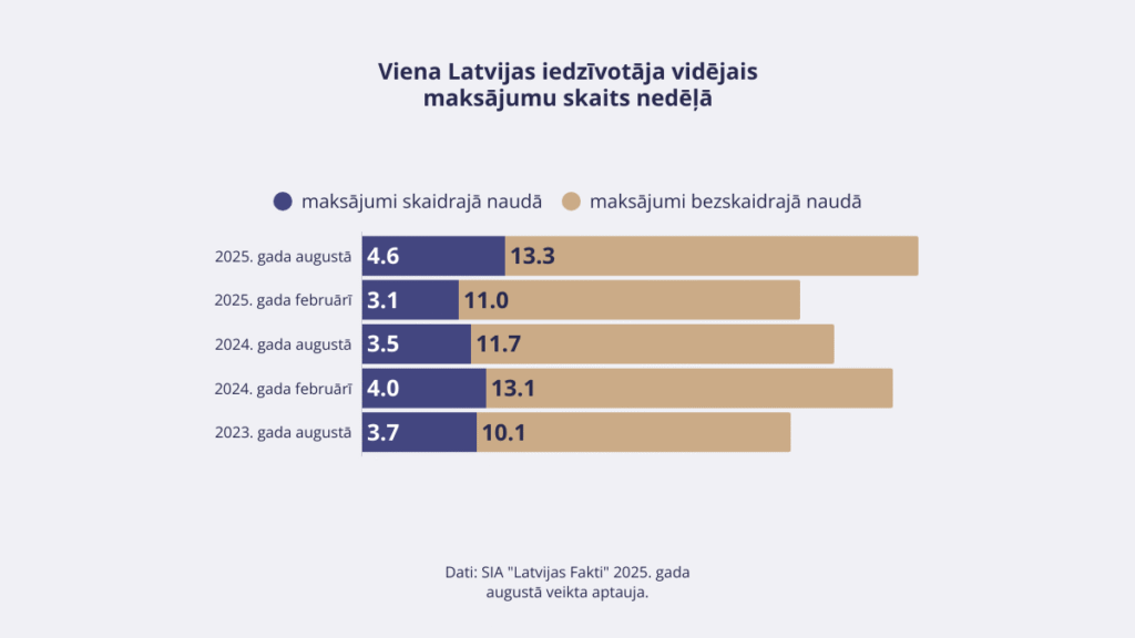 2025. gada augustā vidējais maksājumu skaits, ko viens iedzīvotājs veica nedēļas laikā, bija 17.9 (2025. gada februārī tas bija 14.1, bet 2024. gada augustā – 15.2), t. sk. 13.3 maksājumi bezskaidrā naudā un 4.6 maksājumi skaidrā naudā.
