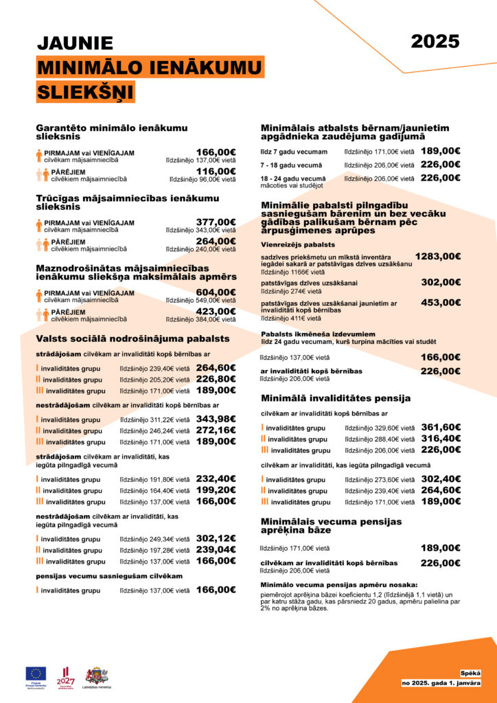 Ir paaugstināti minimālo ienākumu sliekšņi, šādi aptuveni 100 000 cilvēku Latvijā palielinot tiešu finansiālu atbalstu un sniedzot iespēju pieteikties dažāda veida atvieglojumiem un cita veida sociālajai palīdzībai savā pašvaldībā.
