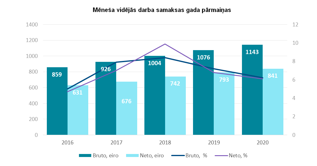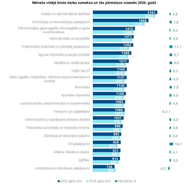 2020. gadā vidējā bruto darba samaksa privātajā sektorā bija 1 138 eiro, sabiedriskajā sektorā – 1 156 eiro, savukārt vispārējās valdības sektorā, kurā ietilpst valsts un pašvaldību iestādes, kā arī valsts un pašvaldību kontrolētas un finansētas kapitālsabiedrības, – 1 121 eiro.