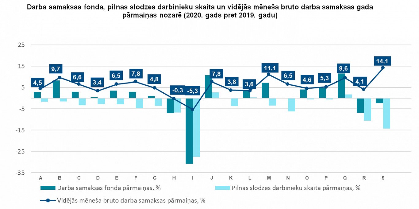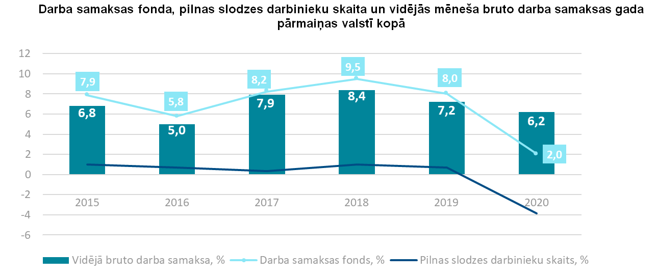 Darba samaksas fonds valstī kopumā pieauga par 200,8 milj. eiro jeb 2,0%, taču tā kritums bija vērojams transporta un uzglabāšanas, izmitināšanas un ēdināšanas pakalpojumu, administratīvo un apkalpojošo dienestu darbības, mākslas, izklaides un atpūtas, kā arī citu pakalpojumu nozarēs, kur gada laikā samazinājās darbinieku skaits.