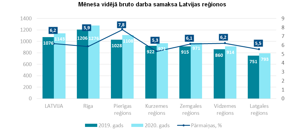 Vidējā mēneša bruto darba samaksa 2020. gadā, salīdzinot ar 2019. gadu, visstraujāk pieauga Pierīgā – par 7,8%. Zemākais pieaugums bija Kurzemē – 5,3% un Latgalē – 5,5%. Rīgā un pārējos reģionos vidējā atalgojuma kāpums bija ap 6% gadā. Vislielākā vidējā darba samaksa pirms nodokļu nomaksas par pilnas slodzes darbu bija Rīgā – 1276 eiro, savukārt viszemākā – Latgalē (793 eiro), kas ir par 38% mazāk nekā valsts galvaspilsētā.