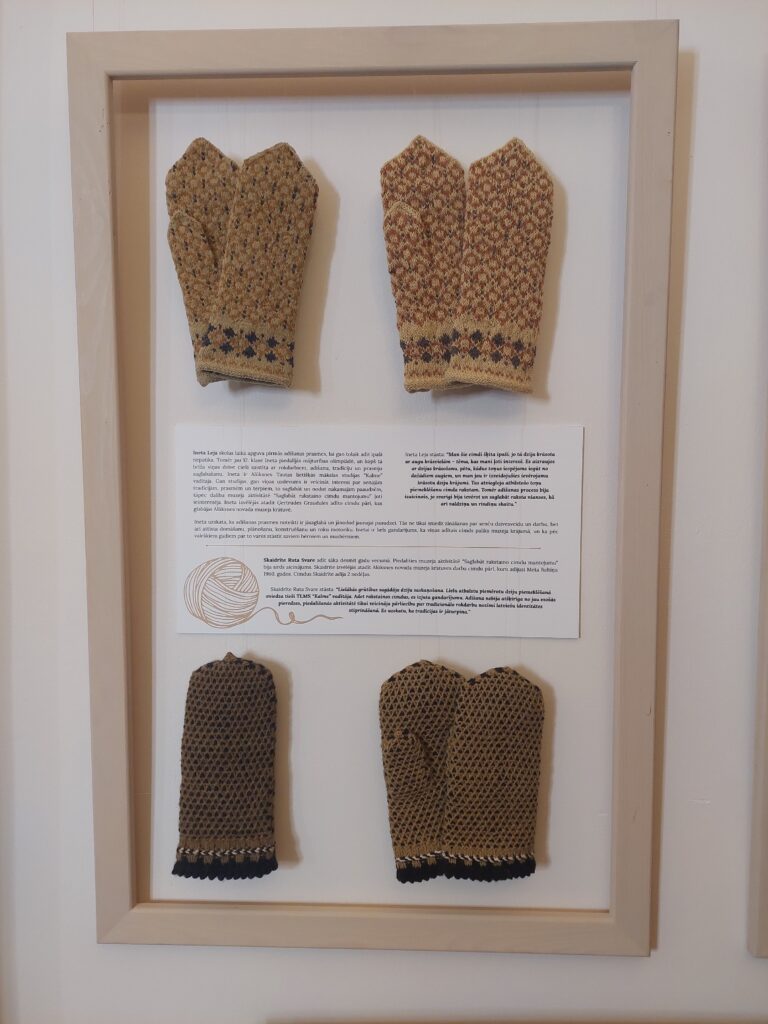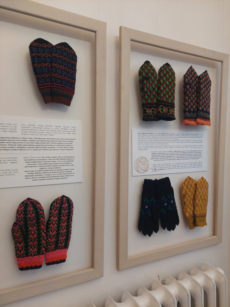 “Katra dalībniece izvēlējās vienu vai divus cimdu pārus no muzeju krājuma un izgatavoja to precīzu kopiju, rūpīgi atdarinot rakstus, krāsas un tehnisko izpildījumu. Regulārās tikšanās muzejā kļuva par vērtīgu zināšanu un pieredzes apmaiņas vietu – dalībnieces kopīgi pētīja oriģinālos cimdus, analizēja dziju struktūru, krāsu salikumus un adījuma blīvumu, veidoja tehniskos zīmējumus un sagatavoja dokumentētus aprakstus, kas kalpos par nozīmīgu resursu nākamajām paaudzēm,” par paveikto stāsta izstāžu kuratore.