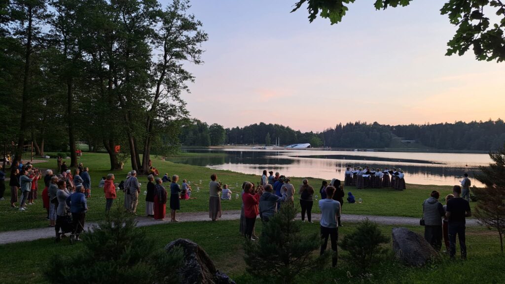 Ezermala bija izrotāta ar degošām laternām un ziediem. Ezera krastu izgaismoja un sildīja patīkams ugunskurs, kurā varēja ziedot dažādas veltes. Tā ir tradīcija, kuru katrs var papildināt ar savu radošumu. Pasākumu vadīja Ziemeru pagasta sieviešu koris “Elisa” un tā diriģente Ilze Briediņa ar dēlu Robertu. Sieviešu balsis pieskandināja visu ezermalu un parku ar dziesmām – Ērika Ešenvalda ”Dvēseles dziesma”, tautasdziesmām “Stāvēju dziedāju”, “Kur tu biji bāleliņi”, “Lokatiesi mežu gali”, “Dziedat meitas, nu ir koši” un citas, kas deva mierpilnu, harmonisku un brīvu sajūtu. Caur tautasdziesmām un Latvijas dabas krāšņumu spilgti atraisījās latviskuma būtība. Koncerta izskaņā Saule tika sveicināta ar dziesmu “Lec, saulīte!” un sekojošiem aplausiem. Īsi pēc brīnišķīgi izpildītajām dziesmām, ezerā palaida vainagu, kas simbolizē Sauli, un visi kopā vēlēja: “Lai top!”. Tālāk pasākuma dalībnieki baudīja nelielu mielastu – svaigu sieru ar ķimenēm, siera cepumus, maizi ar medu, kvasu un pat alu. Mielastu nobaudījuši, aktīvākie devās rotaļās, dziedāja un dejoja smieklu un jaunās saules siltuma pavadījumā.