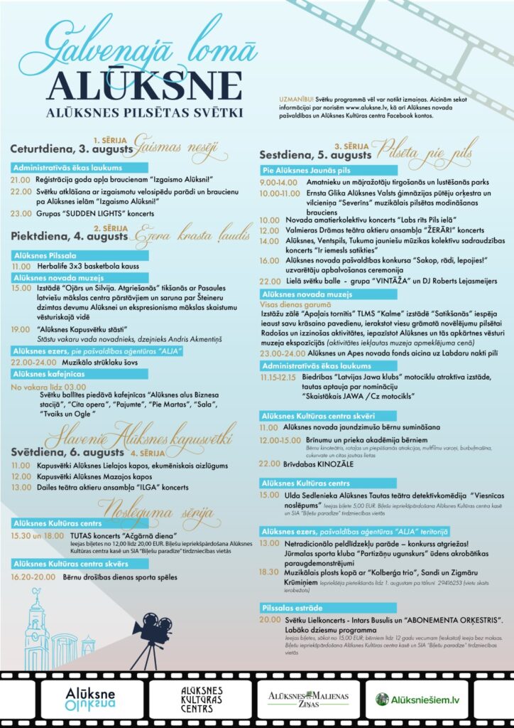 Kā jau svētkos, sarūpēts plašs pasākumu klāsts atbilstoši dažādiem vecumiem un interesēm. Būs mūziķu un grupu koncerti – “SUDDEN LIGHTS”, Intars Busulis un “Abonementa orķestris”, Valmieras teātra aktieru ansamblis “Žerāri”, Dailes teātra aktieru ansamblis “Ilga”. Koncertēs novada amatierkolektīvi, jauniešu muzikālie kolektīvi no Alūksnes, Ventspils un Tukuma. Alūksnes ezerā no Pilssalas varēs vērot muzikālo strūklaku šovu.