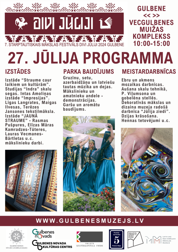 Ebru un akmens mozaīkas darbnīcas. Aušana skalu tehnikā, Pētera Viļumsona un gobelēnu stellēs. Dekoratīvās mākslas un dizaina muzeja radošā darbnīca “Jūlija ziedi” ar Ivonnu Zīli, dzijas krāsošana dabas krāsvielās ar Aneti Karlsoni, hennas tetovējumi u.c. aizraujošas aktivitātes.