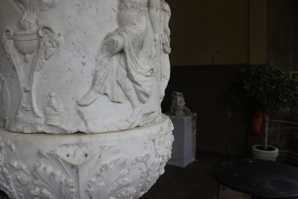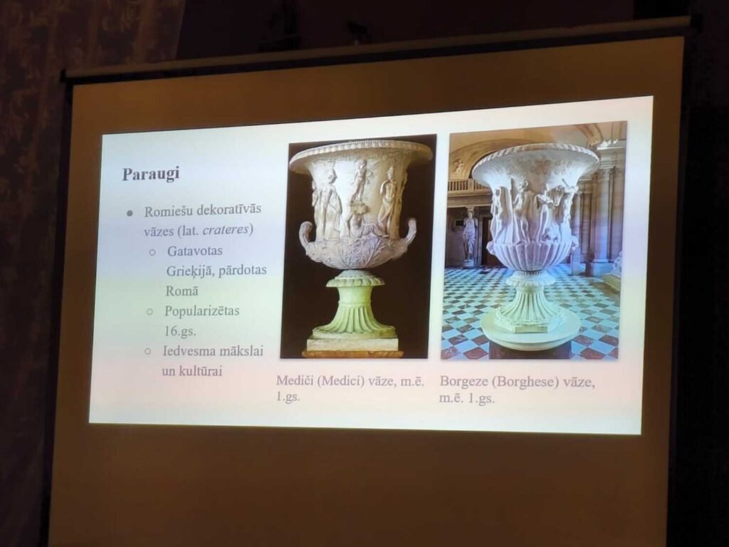 Vāze pēc formas, rotājumu veida un gabarītiem līdzinās antīkajā Romā populārajām dekoratīvajām vāzēm, kādas pārsvarā izgatavoja romiešu villu un dažādu laukumu rotāšanai. Uz tās atveidotas sengrieķu vīna ražas un auglības dieva svētku svinības – dionīsiji, menādas ar vīnogu ķekariem un ziedu vītnēm rokās. Vāzes materiāls, uz tās attēlotie mitoloģiskie tēli, kā arī izpildījuma smalkums liecina, ka tā izgatavota prasmīga klasicisma laikmeta tēlnieka darbnīcā.