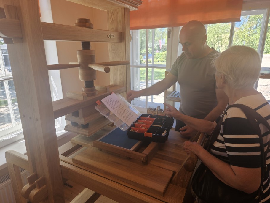 Latvijas evaņģēliski luteriskās baznīcas Alūksnes draudzes priekšnieks Normunds Gražanskis apmeklētājiem parāda par tehniku, kā iespiest vārdus, pastāsta par iespiedmašīnas vēsturi.