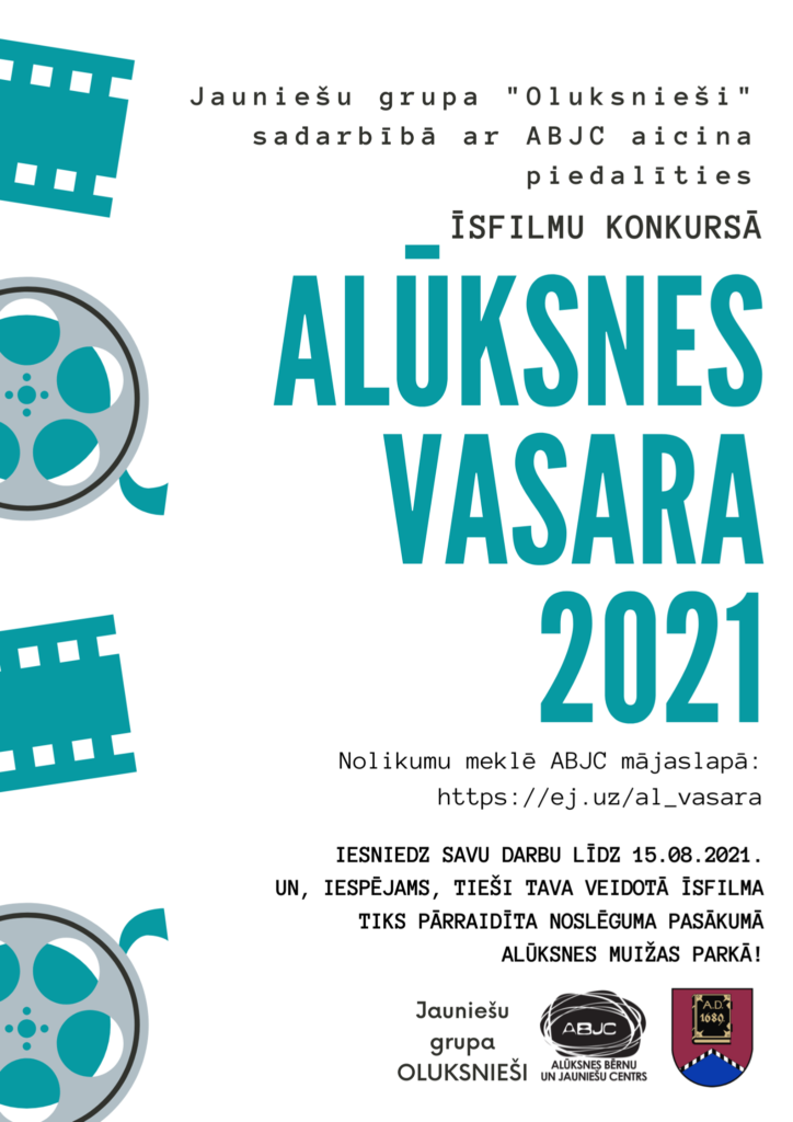 Jauniešu grupa “Oluksnieši” sadarbībā ar Alūksnes Bērnu un jauniešu centrs (ABJC) aicina piedalīties īsfilmu konkursā “Alūksnes vasara 2021”! Nolikumus meklējams ABJC mājaslapā: https://ej.uz/al_vasara. Darbus iespējams iesniegt līdz 15. augustam un, iespējams, kāda veidotā īsfilma tiks pārraidīta noslēguma pasākumā Alūksnes muižas parkā, vēsta organizatori.