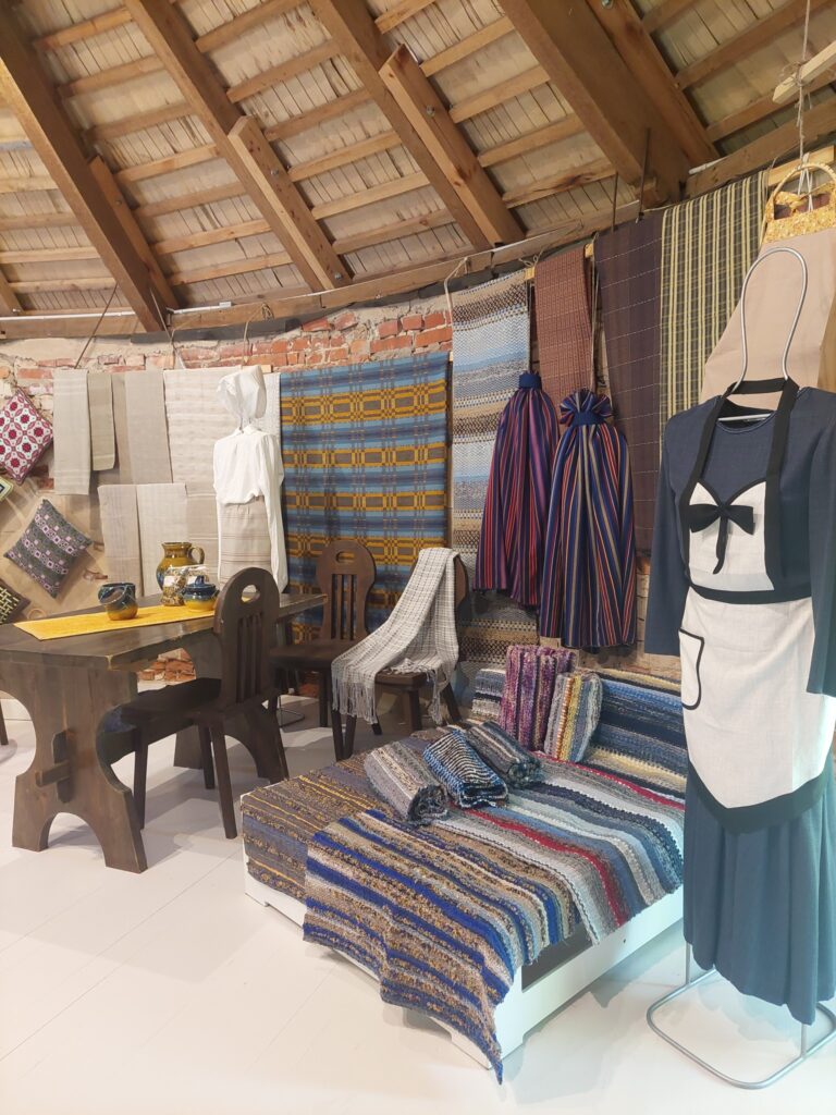 Saimes istabas vidū parasti atradās liels galds, un arī “Kalme” to izstādē akcentē ar galda klājumiem, māla traukiem un tējām. Izstādīti arī dažādu veidu priekšauti, jo kādreiz katrai saimniecei neatņemama tērpu sastāvdaļa bija priekšauts. “Mums gan tie šodien ir modernāki, un var piemeklēt arī vīrietim,” piebilst meistare.