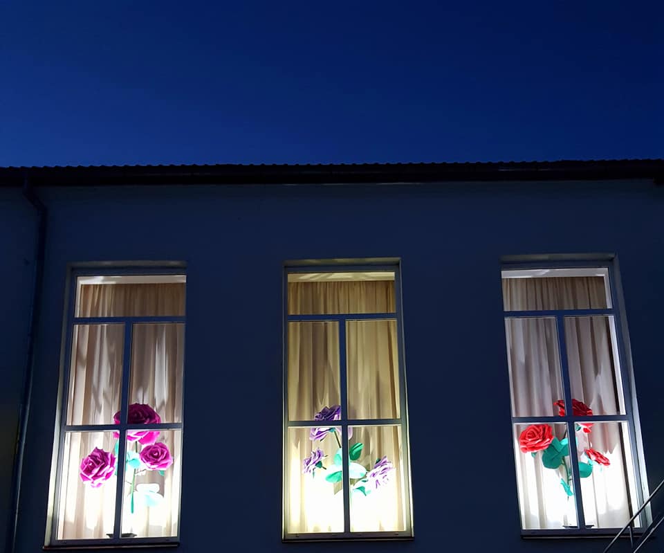 Mārkalnes tautas nama logos saplaukušas krāšņas papīra puķes, lai iepriecinātu vietējos iedzīvotājus. Par izstādi parūpējusies mārkalniete floriste Diāna Vindedze – Volberga.
