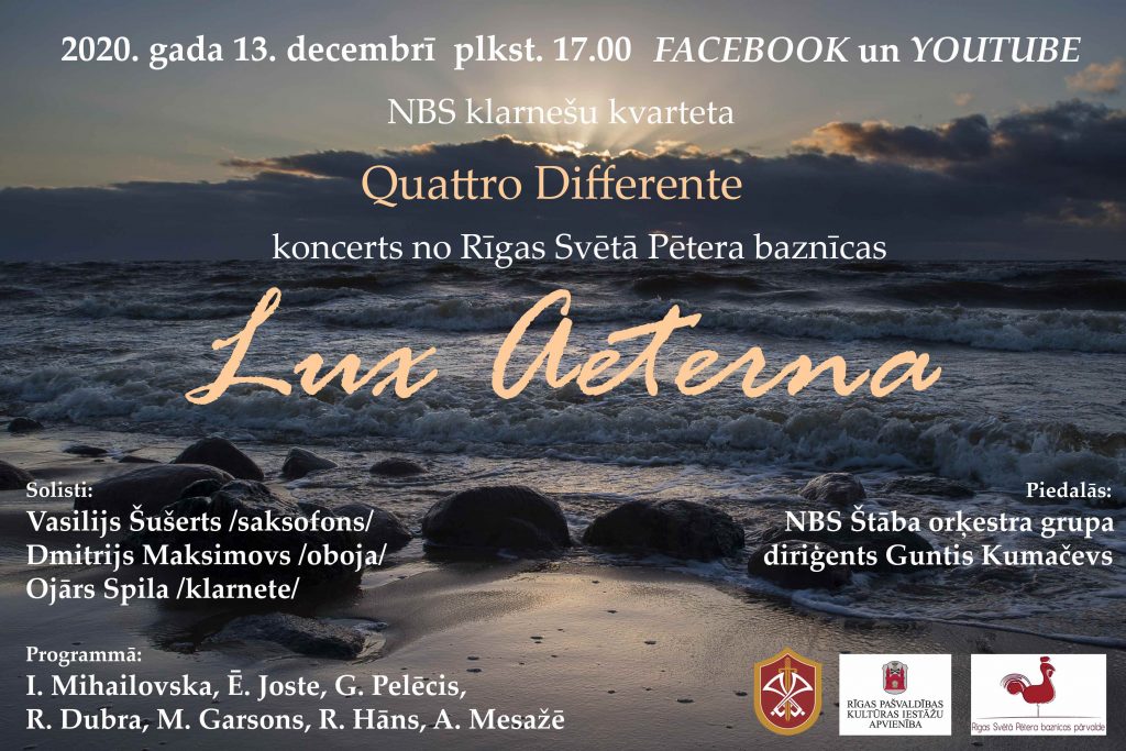 Svētdien, 13. decembrī, plkst.17.00 Nacionālo bruņoto spēku Štāba orķestra “Facebook” un “YouTube” platformās būs skatāms klarnešu kvarteta “Quattro Differente” koncerts “Lux Aeterna”, kurš notiks Rīgas Svētā Pētera baznīcā. Tajā spēlēs virsseržants Guntars Gedroics, seržants Ojārs Spila, seržante Marina Vidmonte un kaprālis Ričards Lapiņš.