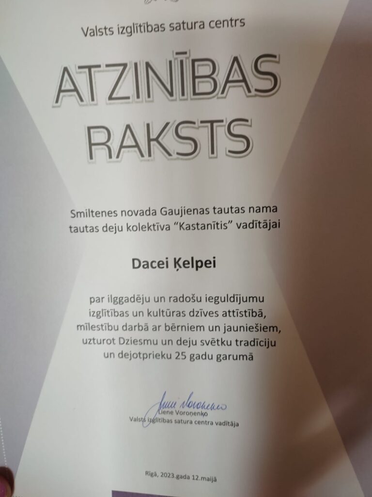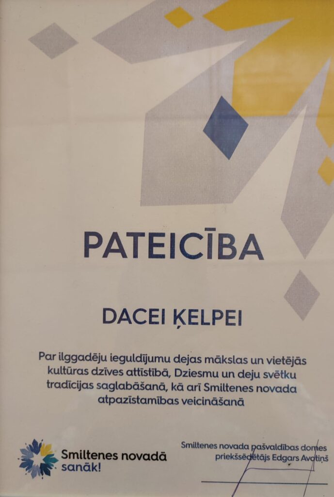 Gaujienas tautas namā Mātes dienas veltītajā bērnu kolektīvu koncertā “Buča tev, buča man, buča manai māmiņai!” Dace Ķelpe saņēma Smiltenes novada pašvaldības pateicību un Valsts izglītības satura centra Atzinības rakstu par ilggadēju un radošu ieguldījumu izglītības un kultūras dzīves attīstībā, Dziesmu un deju svētku tradīcijas saglabāšanā un dejot prieku 25 gadu garumā. D. Ķelpe Gaujienā izveidojusi un vadījusi trīs bērnu deju kolektīvus – “Kastanītis”, “Vidējais kastanītis” un “Mazais kastanītis”.