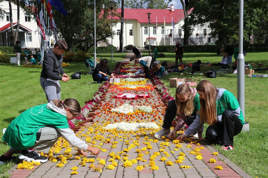 no 9.00 iedzīvotāji tiek aicināti ierasties ar ziediem no saviem dārziem, lai kopīgi veidotu krāšņus ornamentus pie Jaunās pils