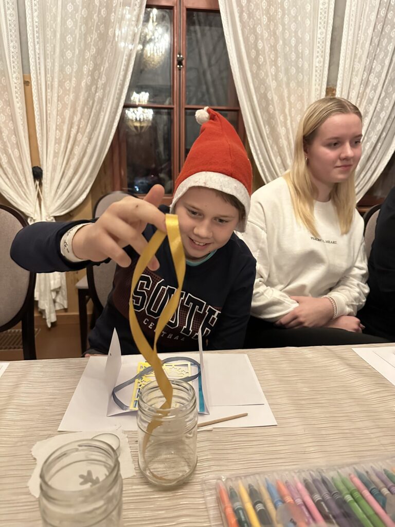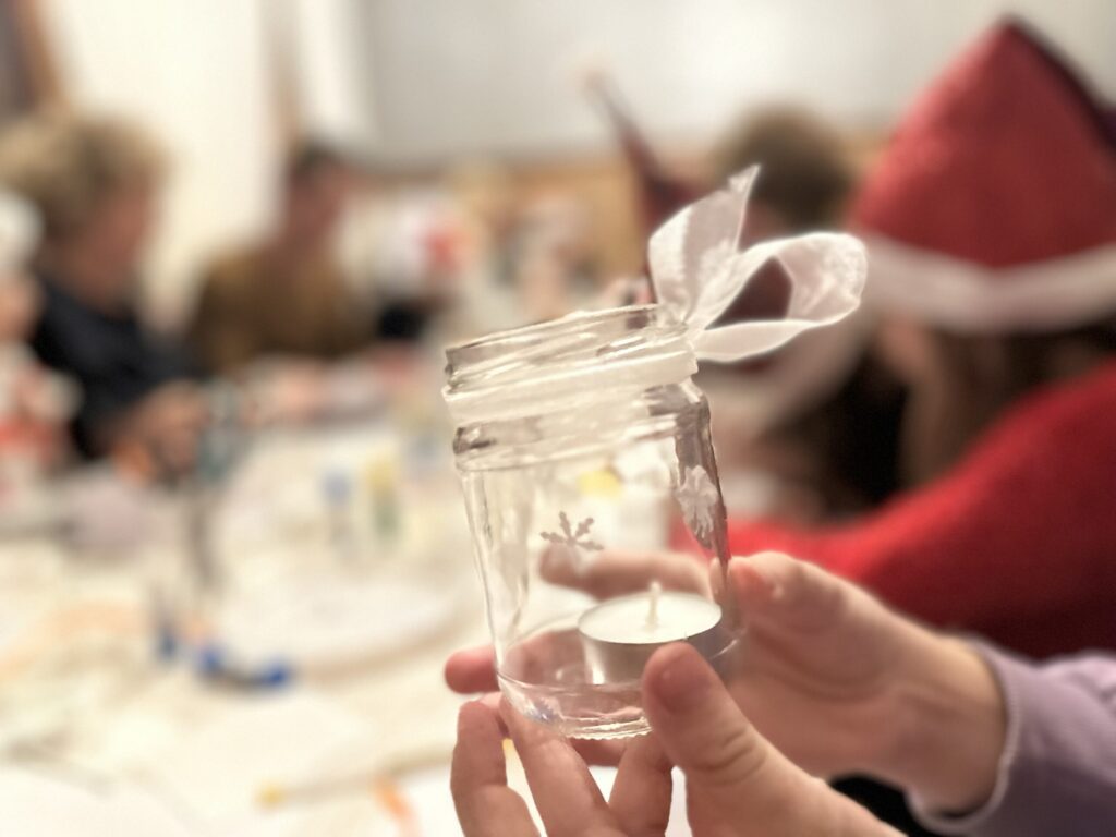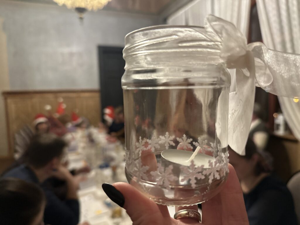 Nodarbības praktiskajā daļā tika gatavots lukturītis burciņā un rotāts ar ziemas motīviem. Šādu lukturīti var izveidot ikviens savās mājās, jo to darina no vienkāršas burciņas, izrotājot un uzlīmējot ar PVA līmi dažādus no papīra izgrieztus ornamentus, un noslēgumā apsienot lentīti.