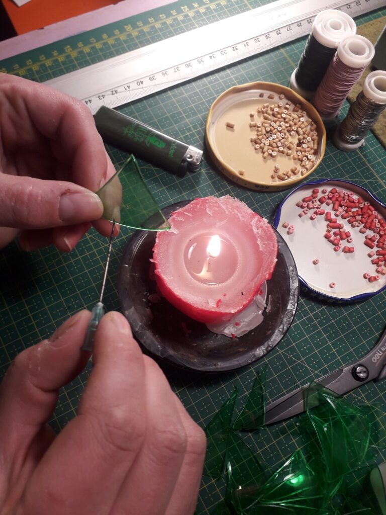 Izmantojamie pamatmateriāli: PET pudele, vecas bižutērijas krelles, no kurām iegūtas pērlītes, metāliska stieplīte. • izmazgājam plastmasas limonādes pudeli, izslaukām; • izmazgājam plastmasas limonādes pudeli, izslaukām; • sagriežam, kā parādīts attēlā; • sagrieztās daļas sagriežam lielākos un mazākos, visādu formu un veidu trijstūrīšos; • paņemam sveci, aizdedzinām un raugāmies, lai liesma ir vienmērīga; • ar pincetes palīdzību tuvinot trijstūra detaļu liesmiņai, pamazām apkausējam maliņas. Tas jāveic ar jūtām, citādi detaļa var apsvilt, palikt melna un izliekties, mainot formu; • sakarsējam adatas aso galu sveces liesmā aptuveni 3 sekundes, lai ar to trijstūra detaļā varētu izkausēt mazu caurumiņu; • ņemam metālisku stieplīti (aptuveni 60 cm garumā), uzveram uz stieplītes pērlīti. Sāk ar mazāko, turpina ar lielākajām; • pamīšus ar pērlītēm ver trijstūra detaļas (sākot no lielākas uz mazāku –