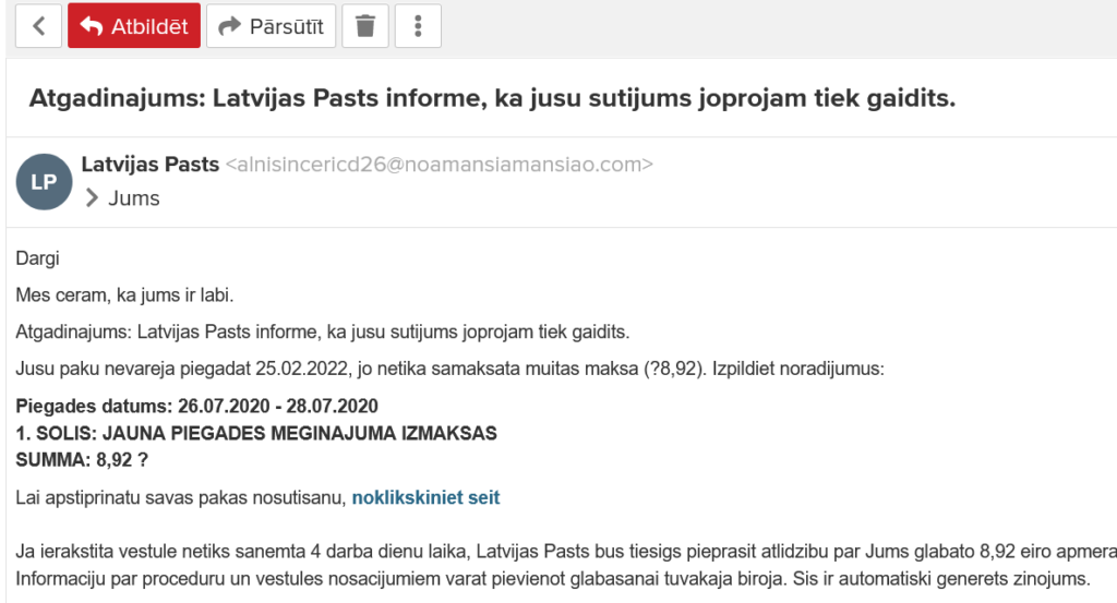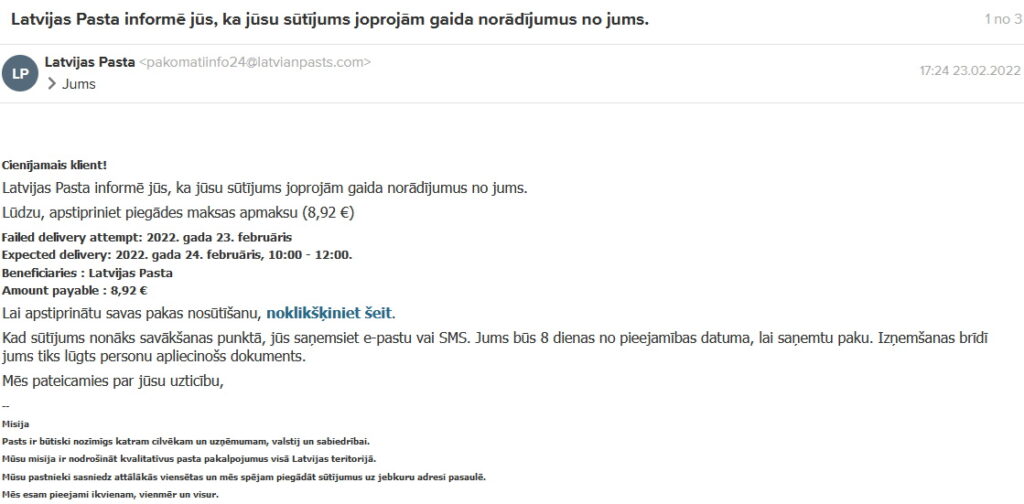VAS “Latvijas Pasts” brīdina klientus uzmanīties no aizdomīgiem e-pastiem, kas sūtīti it kā “Latvijas Pasta” vārdā, mudinot veikt apmaksu par piegādi aizturētam sūtījumam.