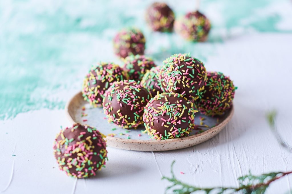 10. Iemērciet bumbiņu karstajā šokolādē un ātri, kamēr šokolāde nav sacietējusi, apberiet to ar dekoriem. Bumbiņas var pasniegt gan atstātas uz irbulīšiem, gan bez tiem.
