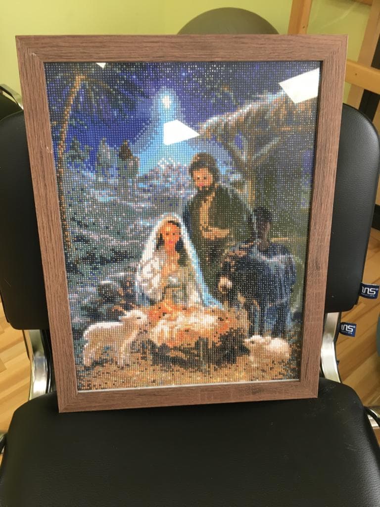 -Andriana pastāstīja klientiem par darbu tapšanu. Visi apbrīnoja viņas veikumu, uzcītību un pacietību, lai izveidotu šādas gleznas. Vēlējums: “Lai pietiek spēka un izturības veidot jaunus darbus!”, tā par izstādi informēja sociālā darbiniece I. Vimba.