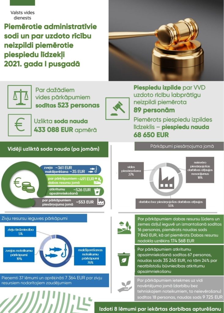 2021. gada 1. pusgadā VVD administratīvi sodījis arī par citiem pārkāpumiem, kas saistīti ar vides aizsardzības prasību neievērošanu. Tā, piemēram, 18 personas sodītas par pārkāpumiem ietekmes uz vidi novērtējuma jomā – darbību bez tehniskajiem noteikumiem vai to neievērošanu, bet par informācijas nesniegšanu, informācijas nepienācīgu sniegšanu vai nepatiesas informācijas sniegšanu VVD, kā arī amatpersonas likumīgo prasību nepildīšanu vai amatpersonas darbības traucēšanu administratīvi sodītas 18 personas.