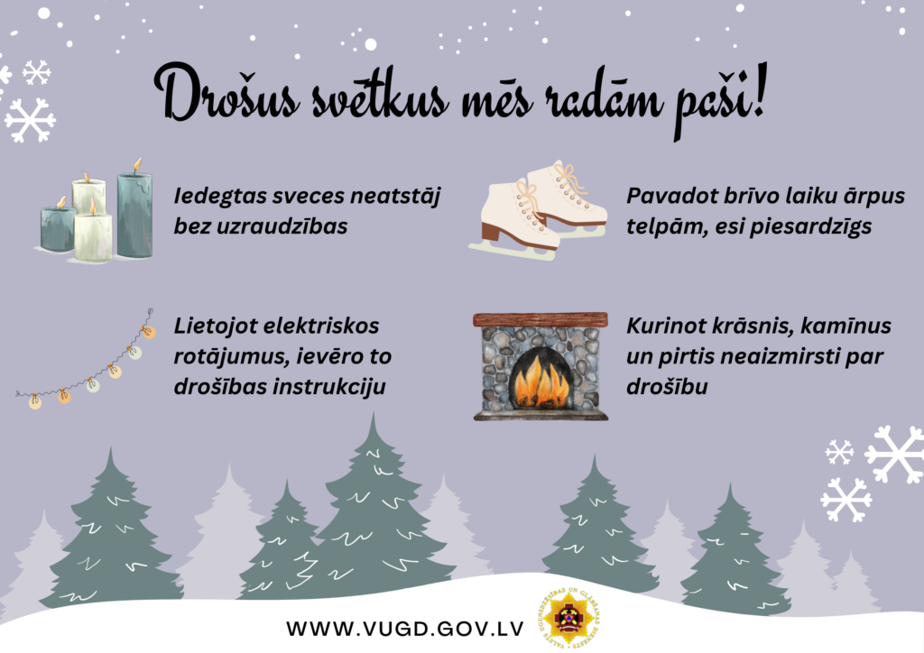 Ziemassvētki ir laiks, kad svinam svētkus, priecājamies par gaismu, ko mājās ienes lampiņu virtenes un svecīšu liesmas, gatavojam svētku mielastu un kurinam krāsnis. Lai svētku svinības nepārvērstos traģēdijā, Valsts ugunsdzēsības un glābšanas dienests (VUGD) aicina cilvēkus neaizmirst par drošību.