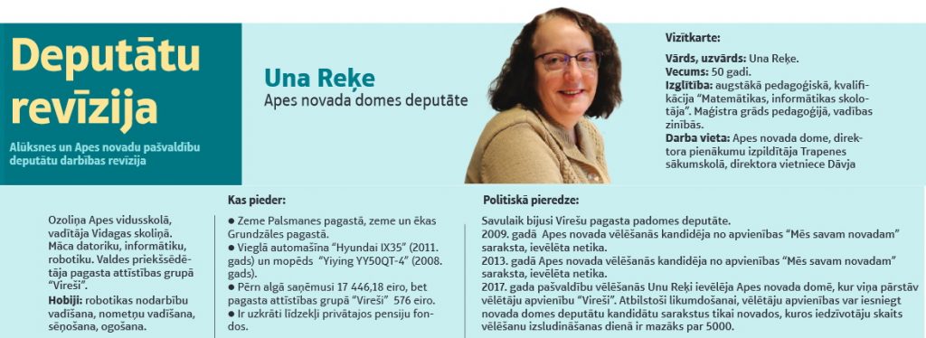 Uzsākot sarunu par trīs gados paveikto, U. Reķe akcentē, ka vēlētāju apvienības “Vireši” pamatvērtība ir cilvēks ar savām vajadzībām, vēlmēm, idejām. Vēlētāju apvienība “Vireši” iestājusies par darbu un sadarbību Apes novada attīstībai. “Vireši” savā programmā solījuši atbalstīt Alūksnes un Apes novada medicīnas iestāžu attīstību, pakalpojumu pieejamību, ko U. Reķe uzsver kā paveikto, jo novadā pieejami primārās veselības aprūpes pakalpojumu sniedzēji, feldšeri, pat zobārsts.