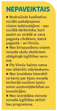 Es apzinos, ka, iespējams, pieejamie resursi ir ierobežoti, bet neesmu dzirdējis, ka Apes novads valsts līmenī būtu tiecies saņemt lielāku naudu. Domē ir atsevišķi darbinieki, kuri sūta vēstules un lūgumus ministrijām, īsti neizvērtējot, vai tas vispār ir parastajam cilvēkam vajadzīgs.