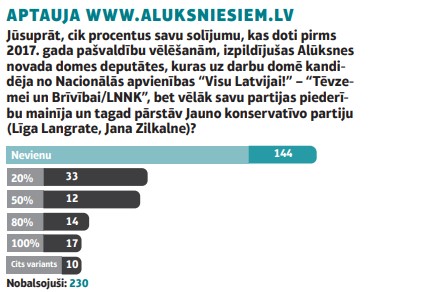 Jana Zilkalne: – Vēlētājus neesmu pievīlusi, jo tie, kuri atbalstīja mūs pirms vēlēšanām, vēl joprojām ir kopā ar mums, izsaka priekšlikumus, vērtē mūsu darbu. Uzsākot darbu domē, sapratām, ka vēlamies strādāt atklāti, godīgi un ievērojot labu pārvaldību, tādēļ izvēlējāmies aiziet no Nacionālās apvienības. Pirms iestāšanās Jaunajā konservatīvajā partijā apzinājām to, vai mums sakrīt nākotnes mērķi un vērtības. Ja tā nebūtu, mēs nepievienotos šim poliskajam spēkam. Jā, iespējams, kāds no vēlētājiem bija vīlies, bet mēs savu iesākto darbu turpinājām.