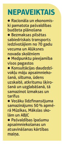 Vētījot deputātes paveikto un nepaveikto, par pamatu izmantojām priekšvēlēšanu programmu darbam Alūksnes novadā – sākotnēji no NA un turpinot iesākto JKP.