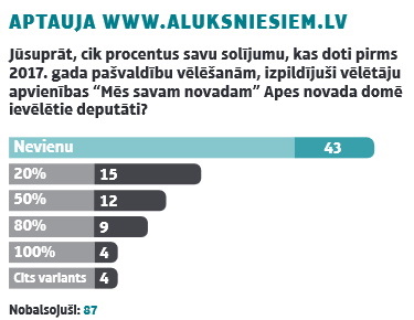 J. Liberts pārliecinoši teic, ka visu priekšvēlēšanu programmā solīto ir izpildījuši. Tomēr portālā www.aluksniesiem.lv iedzīvotāju aptaujā atklājas cita aina. Pēc iedzīvotāju domām, nav izpildīts neviens solījums. “Man ir žēl to cilvēku, kuriem tā šķiet. Vai viņi vispār ir no Apes novada, vai viņi ir bijuši un redzējuši, kā dzīvojam Apes novadā? Lai viennozīmīgi pateiktu, ka nekas nav izdarīts, jābūt aklam. Vai šie cilvēki ir lasījuši vēlēšanu programmu?” retoriski jautā J. Liberts.