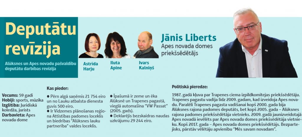 Vai Apes novads juta kādu pienesumu, laikā, kad A. Harju pildīja Saeimas deputāta pienākumus? “A. Harju Saeimā nokļuva laikā, kad beidza pastāvēt deputātu kvotas. Nekādu finansējumu papildus nesaņēmām. Vienīgais, ko ieguvām – vienmēr zinājām, kas notiek valdībā un ko plāno. Mūsdienās daudz maksā arī informācija,” saka J. Liberts.