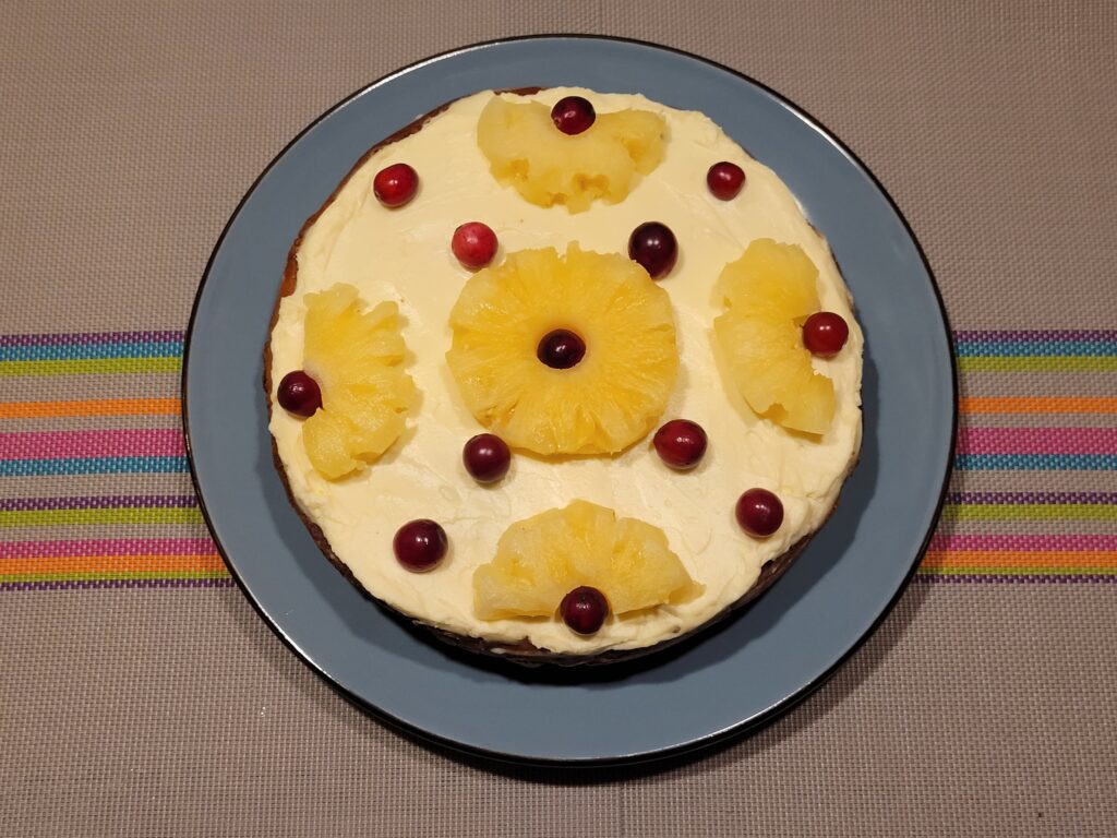Saņēmusi dāvanā ananasu, meklēju recepti, ko no tā varētu pagatavot. Izraudzījos šo, jo tā šķita vienkārša, arī daudz laika tam veltīt te, šķita, nevajadzētu. Darbdienu vakaros gan šim “pasākumam” pievērsties neiznāca, tādēļ ananass vēl pastāvēja neaiztikts. Taču pēc tam tas jau sāka tik kārdinoši smaržot, jo bija labāk nogatavojies, ka liku lietā nazi un sulīgo augli gardu muti notiesājām svaigu. Tā izmantošana kūkā jau būtu grēks – tur taču iespējams iztikt ar kompotu no metāla kārbas! Domu par kūkas cepšanu gan netiku atmetusi un pēc dažām dienām ķēros pie darba. Bļodā iesijāju miltus ar cepamo pulveri (divas tējkarotes bez kaudzes), iebēru glāzi cukura (sākotnējā receptē bija paredzētas pat divas, bet – kur nu tik saldu!) un vaniļas cukuru, tad pievienoju olas, notecinātus un sīki sagrieztus konservēto ananasu gabaliņus, pielēju arī glāzi sīrupa no kārbas (pietika ar iegādāto 565 mililitru tilpumā). Visu labi samaisīju. Mīklu lēju ar cepamo papīru, ko vēl nedaudz ietaukoju ar eļļu, izklātā nelielajā veidnē ar noņemamo gredzenu, izlīdzināju un ievietoju līdz 175 grādiem uzkarsētā cepeškrāsnī. Pēc aptuveni 45 minūtēm kūka bija gatava. Gatavību gan vēl pirms celšanas ārā no krāsns pārbaudīju ar koka irbulīti. Izcepto kūku no veidnes izņēmu un liku uz restītēm. Kamēr tā dzisa, saputoju klasisko krēmsieru kopā ar mīkstu sviestu un pāris ēdamkarotēm pūdercukura. Pagatavoto krēmu pēc tam vienmērīgi uzklāju uz vēl siltas kūkas. Tad to atdzesēju pilnībā un rotāju ar notecinātiem vēl atliktajiem dažiem ananasu gabaliņiem no kompota un lielogu dzērvenēm. Kad biskvītu biju izcepusi, mazliet gan šaubījos: kas labs tur var iznākt, ja ne krējums, ne sviests, ne eļļa vai cita taukviela mīklai taču netika pievienota, varbūt cepums būs tāds paliess… Taču rezultāts izdevās pietiekami sulīgs, arī pārklātais krēms te labi iederējās, un otrā dienā kūka, kad tā bija vairāk ievilkusies un “atpūtusies”, šķita pat vēl gardāka.