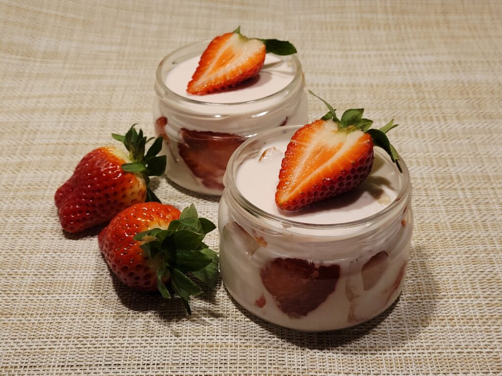 Sastāvs: 100 gramu biezpiena, 200 mililitru jogurta, 3 ēdamkarotes pūdercukura, 5 – 7 zemenes, 50 gramu biskvīta cepumu, 50 mililitru ūdens, 1,5 tējkarotes želatīna, vaniļas cukurs un šokolāde.