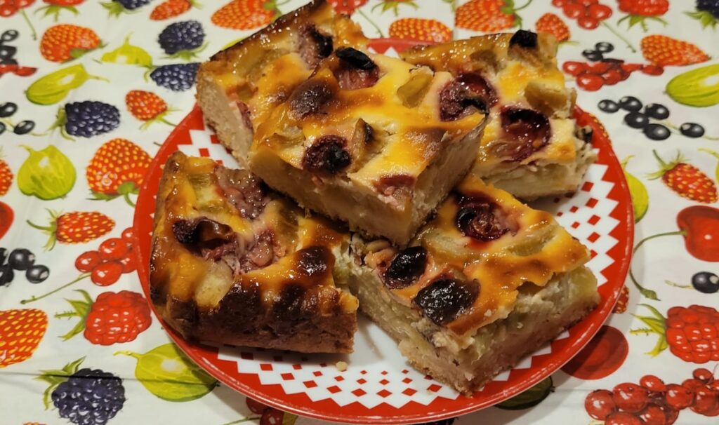 Gardākā rabarberu pīrāga receptes meklējumos atradu arī šo un izcepu šādu kārumu. Tiesa gan, sēkliņas te neizmantoju, arī pārlējumam ņēmu par vienu olu mazāk. Man pa rokai bija 30 x 25 centimetrus liela taisnstūra veidne, tādēļ pīrāgs izdevās biezāks. Ja to gribam izcept plānāku, kā plātsmaizi, tad mīklu varam ieklāt un izlīdzināt lielāka izmēra veidnē vai uz plāts, tikai tad jāraugās, lai pārlējums netecētu tai pāri, jo cepoties mīkla pacelsies. Rabarberus nomazgāju, apsusināju, nomizoju un sagriezu gabaliņos. Apbēru tos ar nelielu cukura daudzumu. Sagriezu arī noskalotas un apsusinātas zemenes. Biezpienu (jāraugās, lai tas nav graudains) samaisīju ar mīkstu, mazliet uz plīts paturētu cepšanai paredzēto margarīnu. Pievienoju olu, piemaisīju cukuru, izsijātus miltus un etiķī dzēstu sodu un samīcīju mīkstu mīklu. Sajaucu kopā visas sastāvdaļas, kas nepieciešamas pārlējumam, – šoreiz gan ņēmu tikai trīs olas, tām pievienoju skābo krējumu, cukuru un vaniļas cukuru pēc garšas. Maisīju, līdz cukurs bija izkusis. Veidni izklāju ar cepamo papīru un ar rokām izlīdzināju tajā mīklu tā, lai veidojas arī apmalītes. Uz mīklas vienmērīgi izlīdzināju rabarberu gabaliņus un zemenes. Visu pārlēju ar skābā krējuma un olu maisījumu. Pīrāgu cepu līdz 180 grādiem uzkarsētā cepeškrāsnī vismaz 45 minūtes.